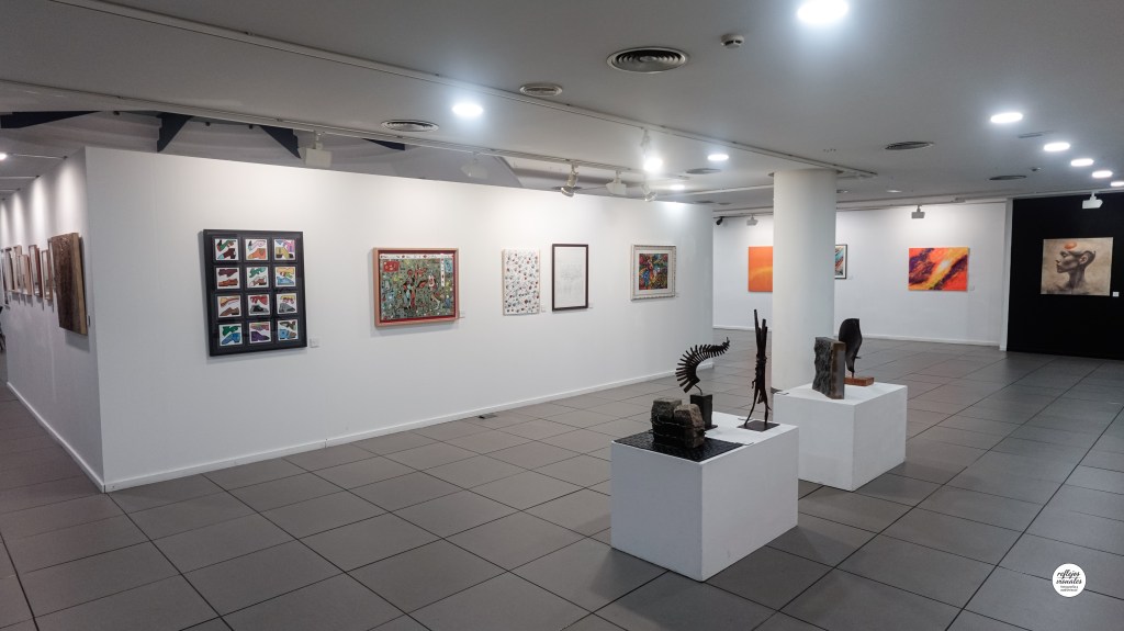 Las fotografías de la exposición muestran esta diversidad: la instalación de cilindros cerámicos que se despliega como un paisaje de formas, los muros blancos repletos de pinturas y grabados, esculturas en pedestales que marcan el ritmo del recorrido y obras que van de la abstracción cromática al realismo más íntimo. Todo ello construye un itinerario visual en el que el visitante pasa de un ambiente a otro, como si atravesara estaciones distintas de un mismo viaje colectivo.